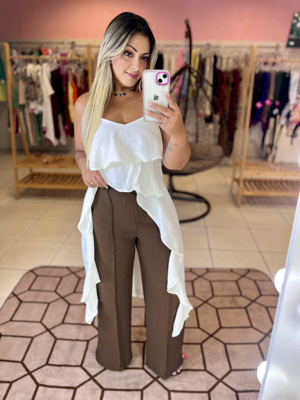 A tendência Boho Chic já está dominando os lookinhos por aqui. bata com tecido duna e babados, alcinha com ajuste, elástico na parte das costas, mais longa na parte de trás, caimento perfeito,  veste até 44/46 ou seja o P ao GG de busto