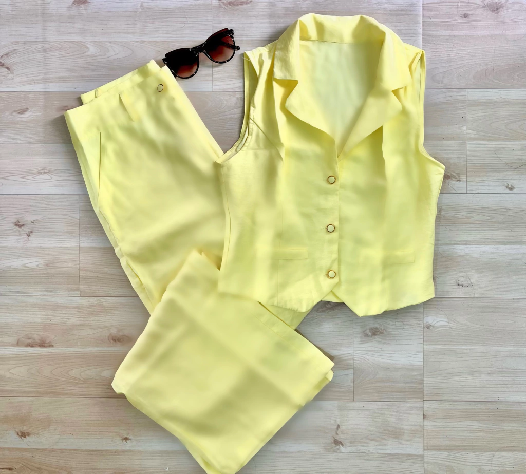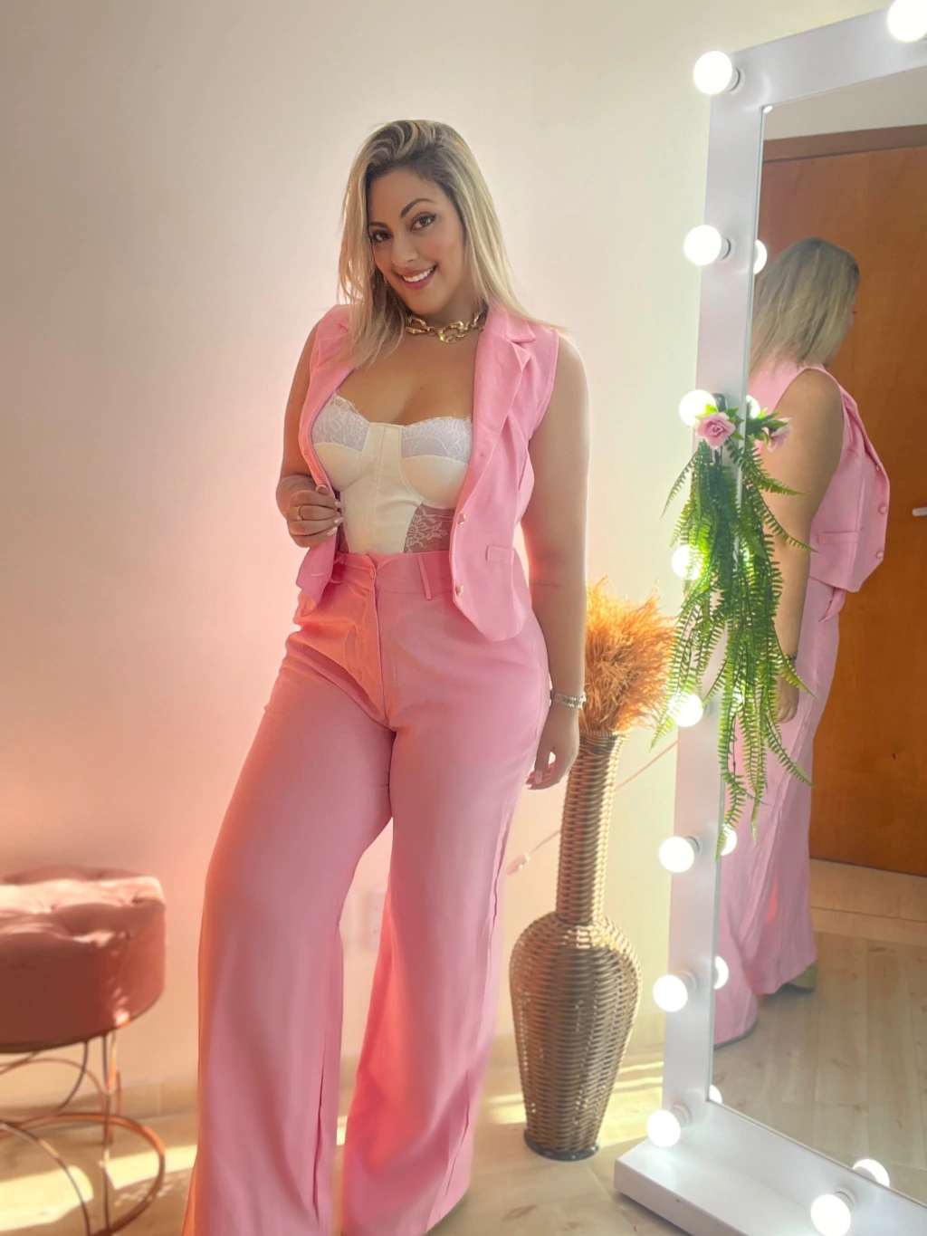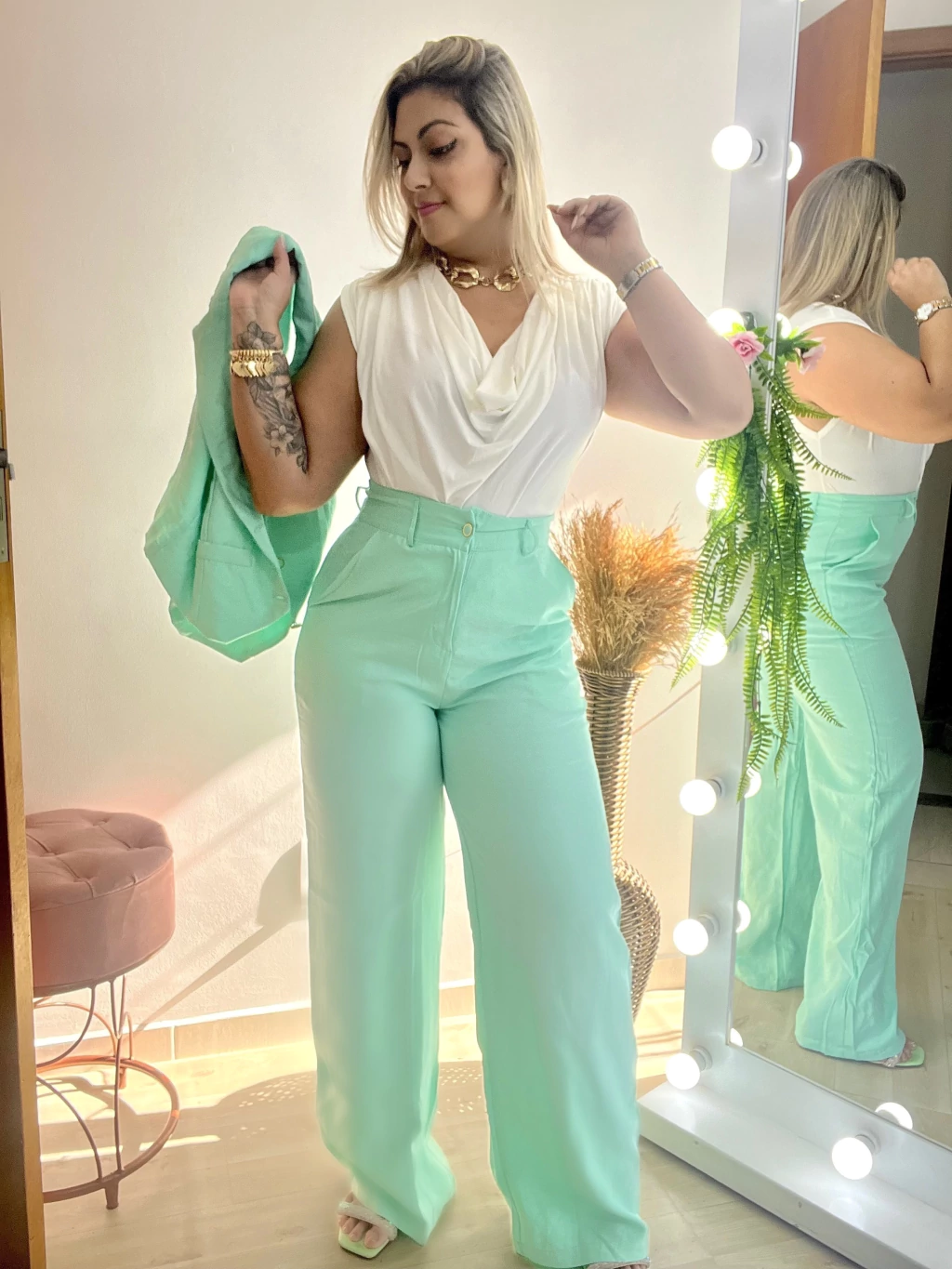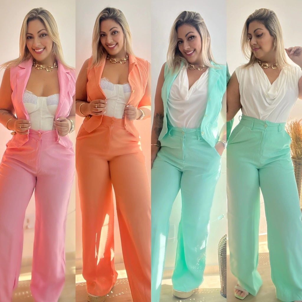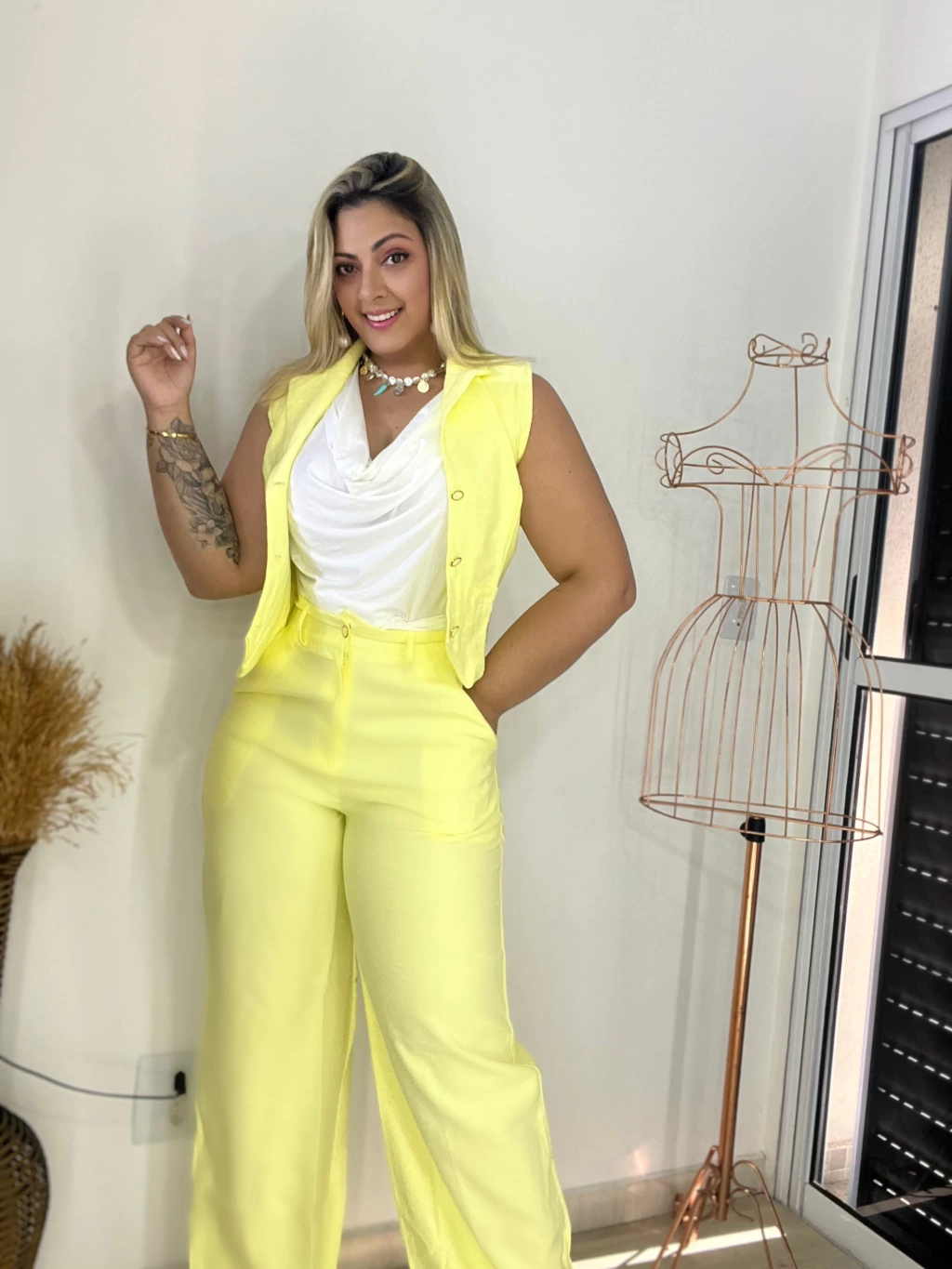 Conjunto em tecido linho composto de calça e colete, com botões no mesmo tom encapados e com contorno em dourado, elegância e estilo em um único conjunto!