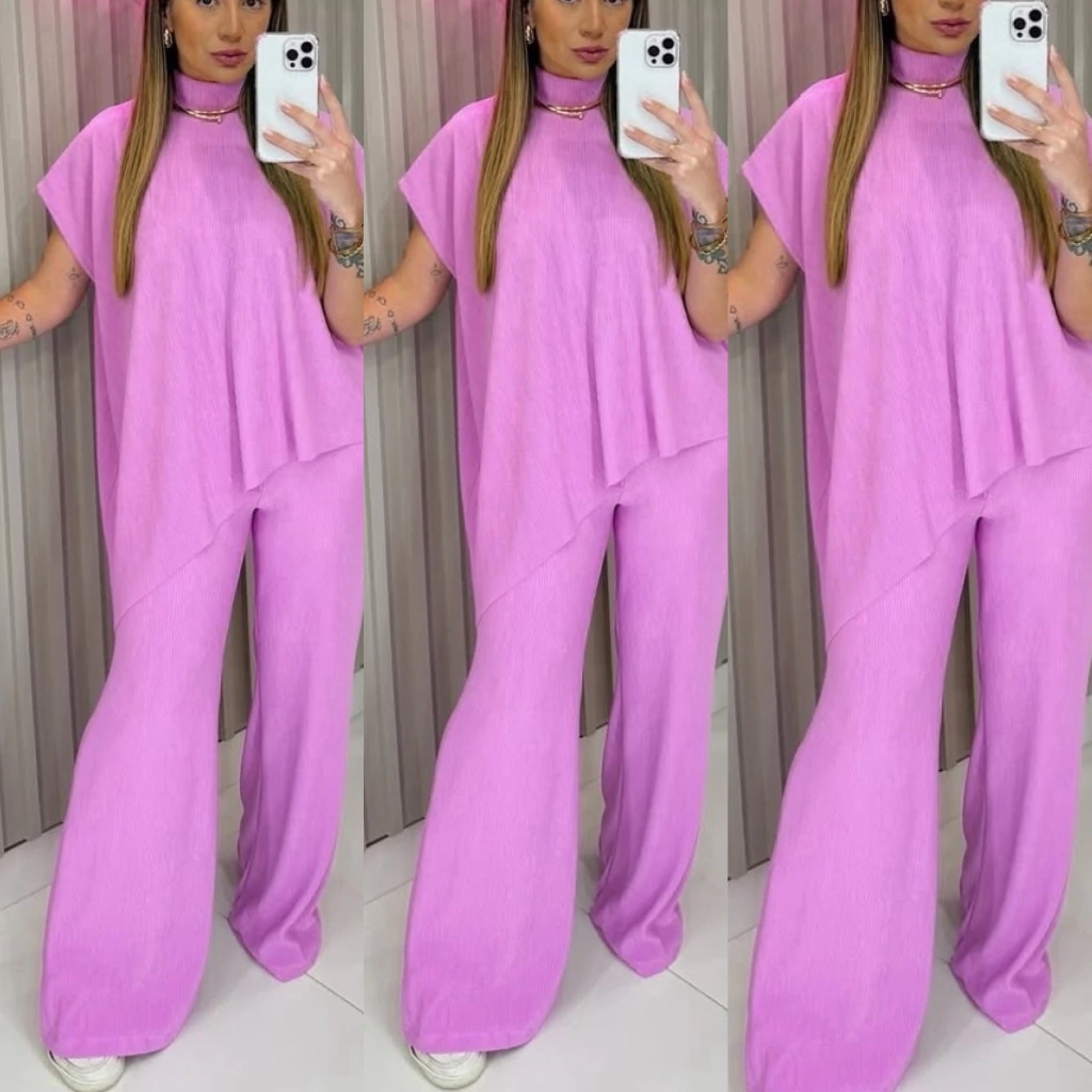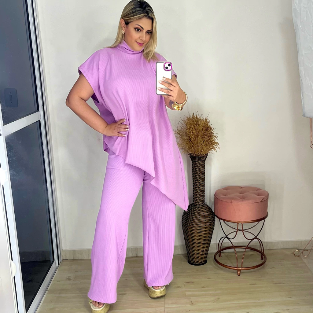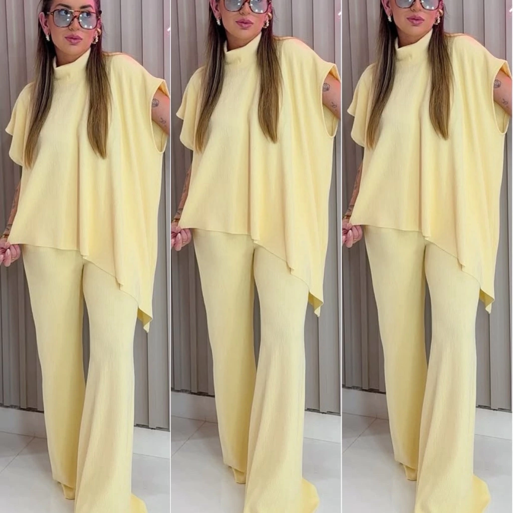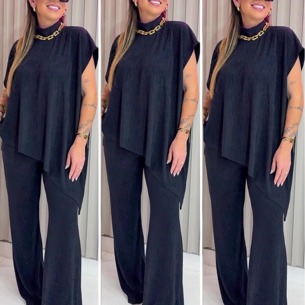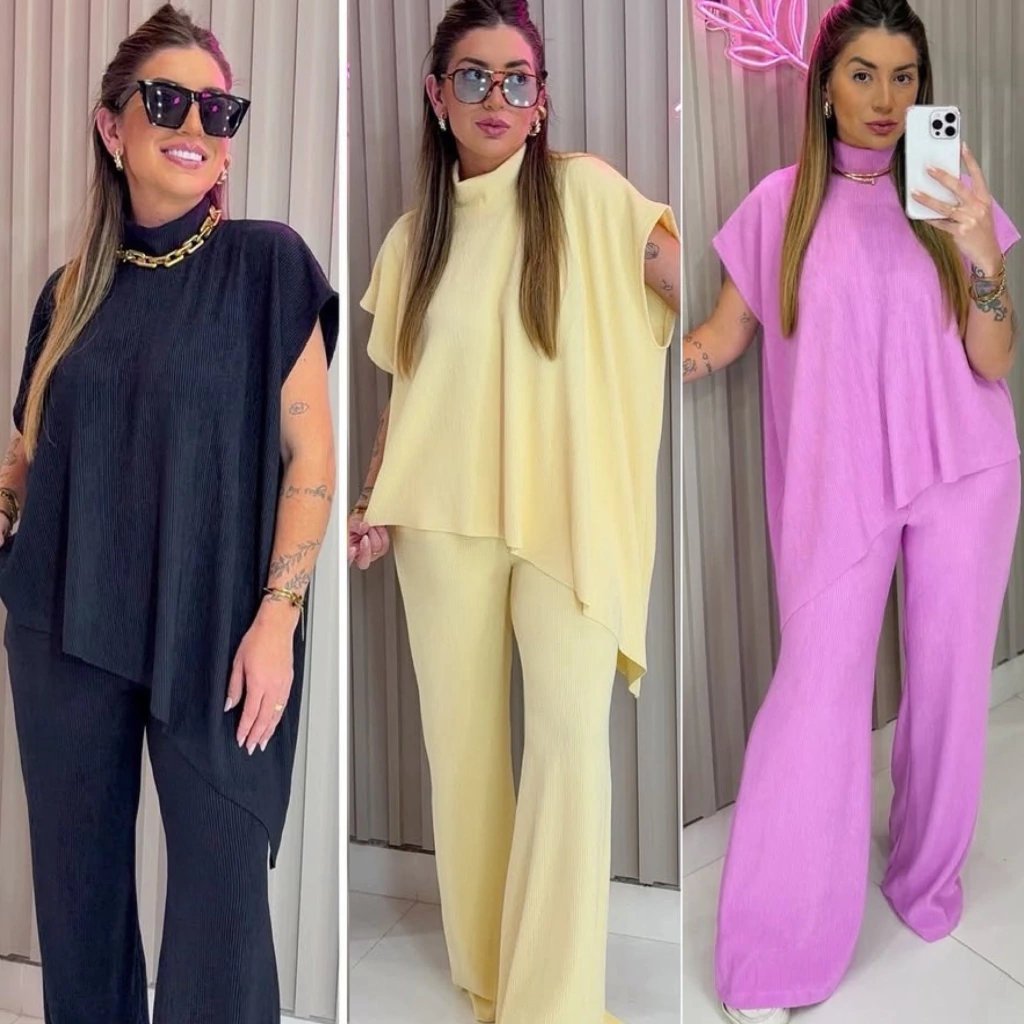 Conjunto perfeito e em tecido Ana ruga aquele tecido que favorece tanto looks sofisticados como também os mais despojados, possui recorte assimétrico na parte da blusa alongamdo a silhueta, tecido confortável e que super estica tem bastante elastano e veste do 38 ao 44. Possui gola alta.