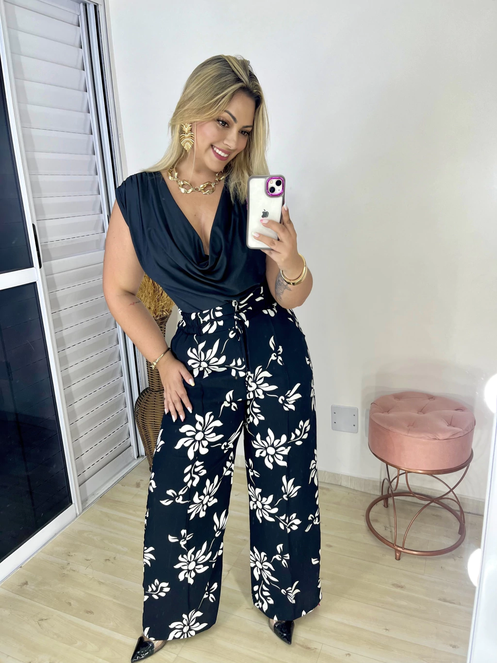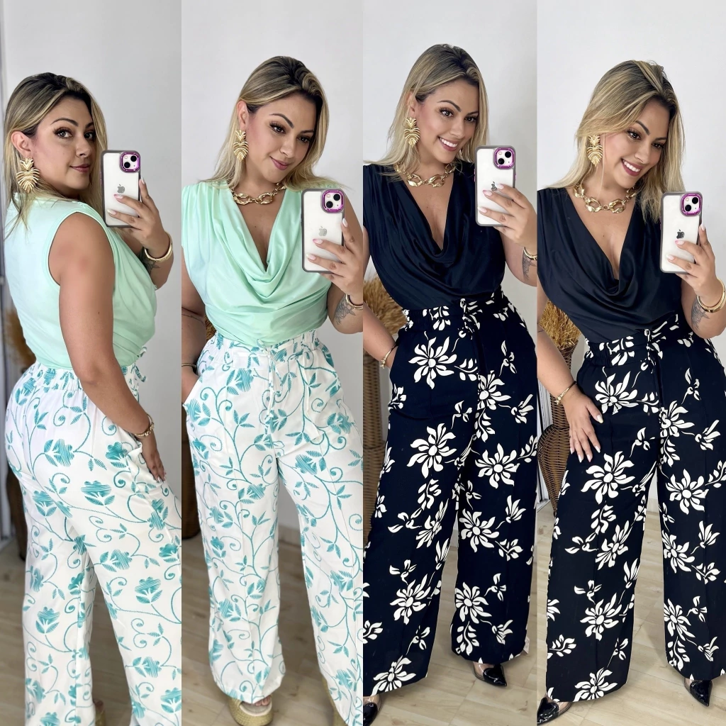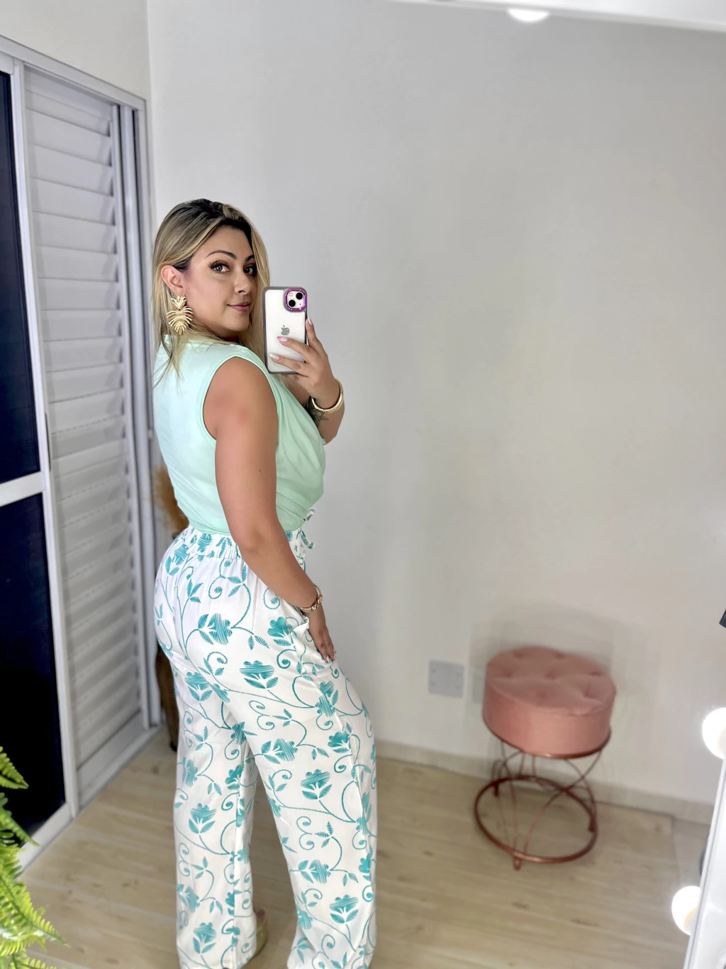 Pantalona em tecido de crepinho, com forro de shortinho por baixo, elástico na parte de trás e amarração frontal, tecido não amassa, não encolhe e não desbota. Possui bolsos nas laterais.