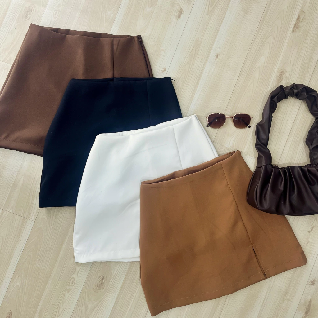 Short saia em tecido alfaiataria ficando como shortinho atrás e saia na frente com uma fendinha super delicada. Possui zíper na lateral.