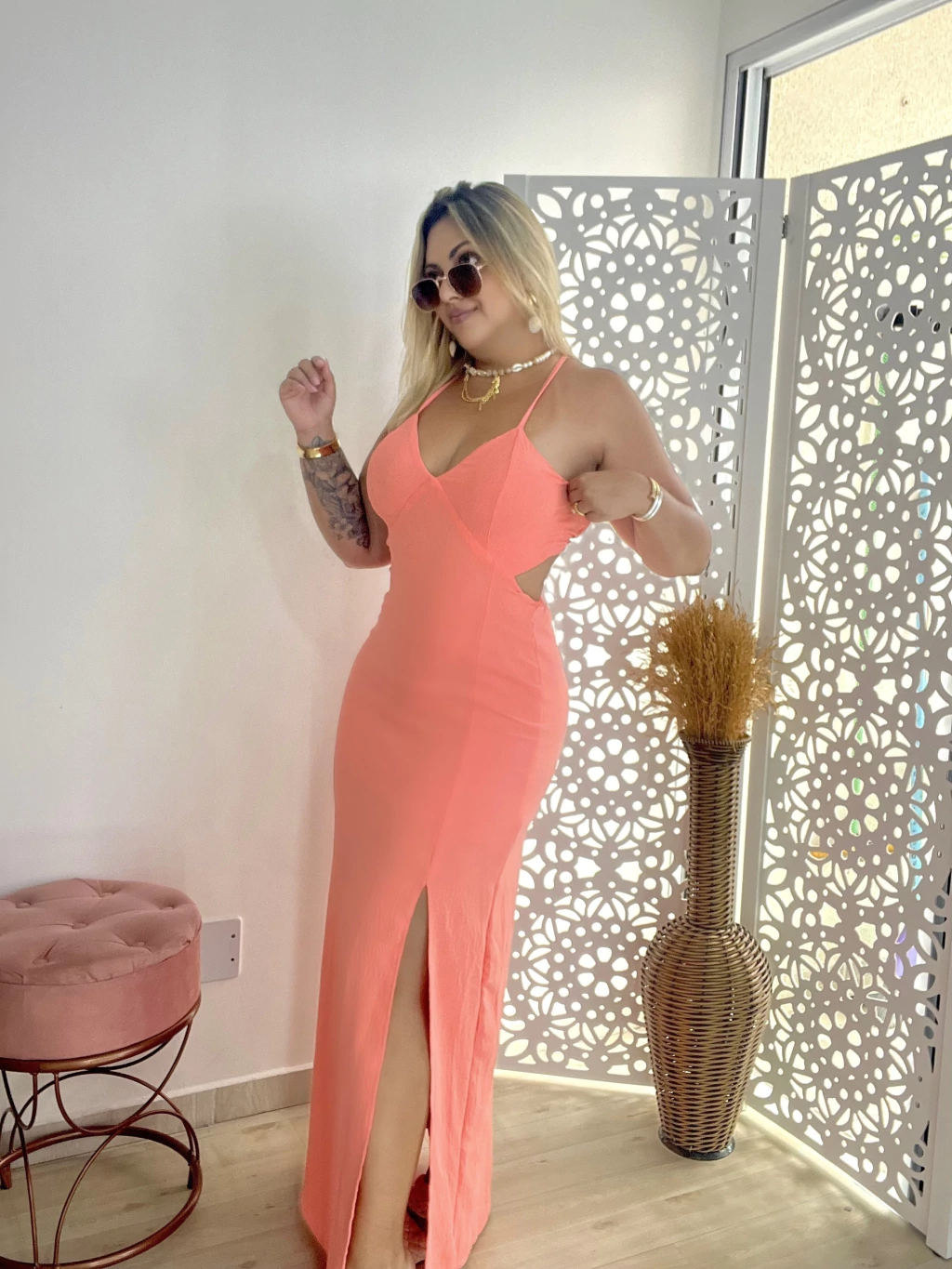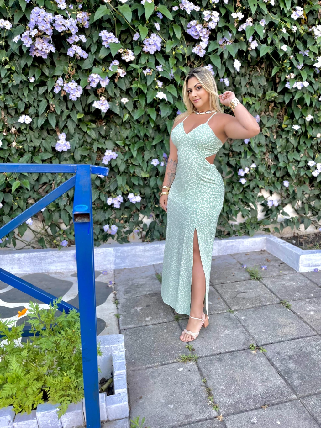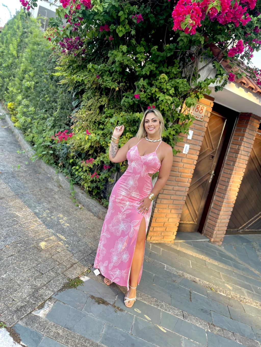 Vestido em comprimento midi, em tecido de malha crepe acetinada super fresquinha, com forro mais curtinho por baixo, possui bojo e fenda frontal super elegante, atrás possui elástico na cintura e também alcinhas de transpassar para melhor ajuste no busto.
