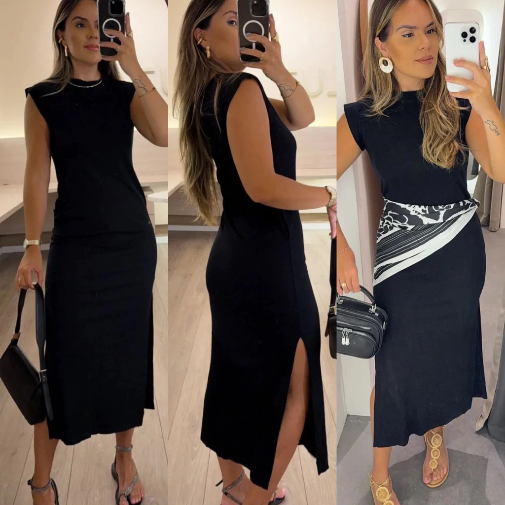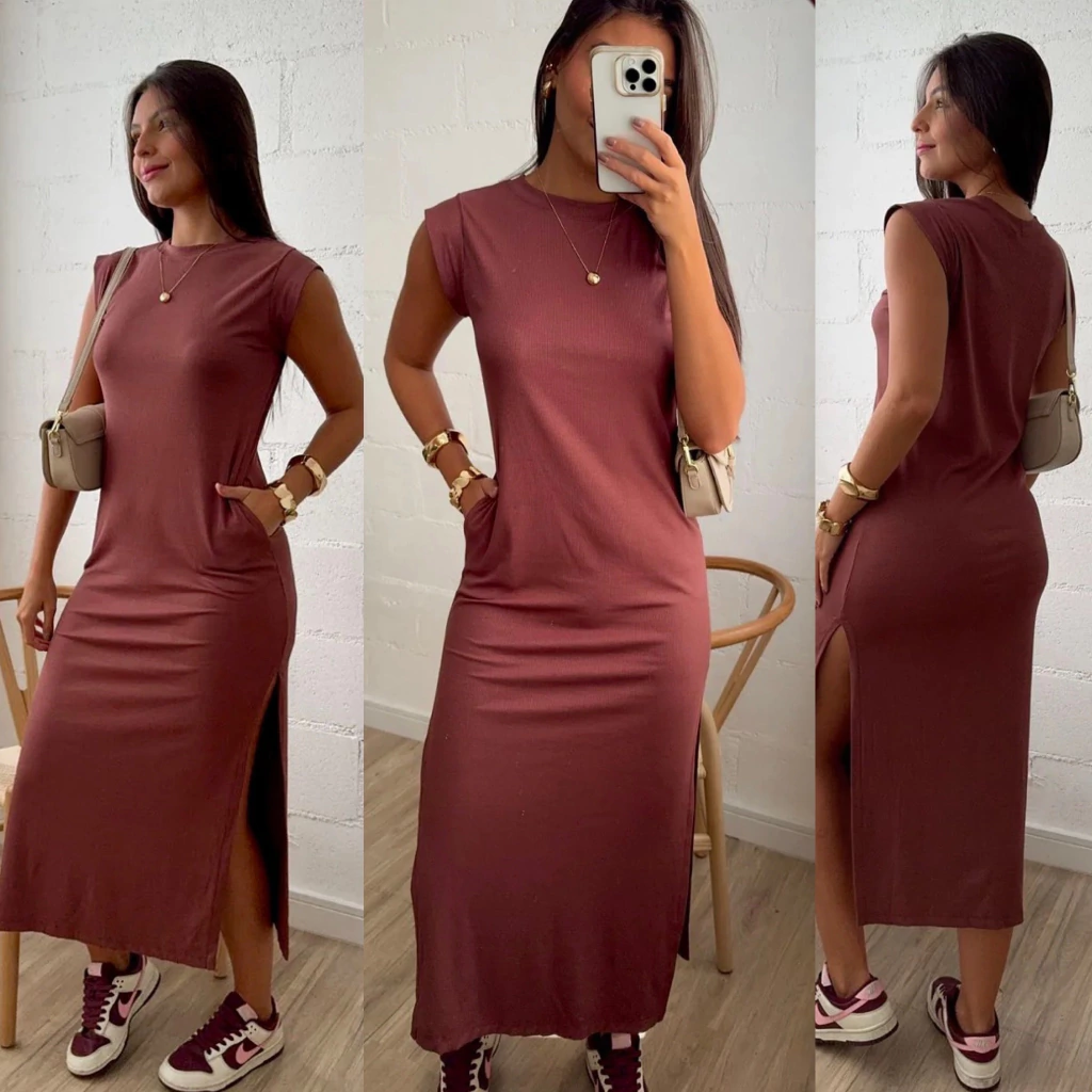 Vestido em comprimento midi, tecido moletinho com bastante elastano, possui bolsos nas laterais e manguinha Muscle, fendas laterais, aquele básico necessário, elegante e confortável que você precisa ter no seu guarda roupas. Tamanho único, veste do 38 ao 44/46 aproximadamente devido sua elasticidade.